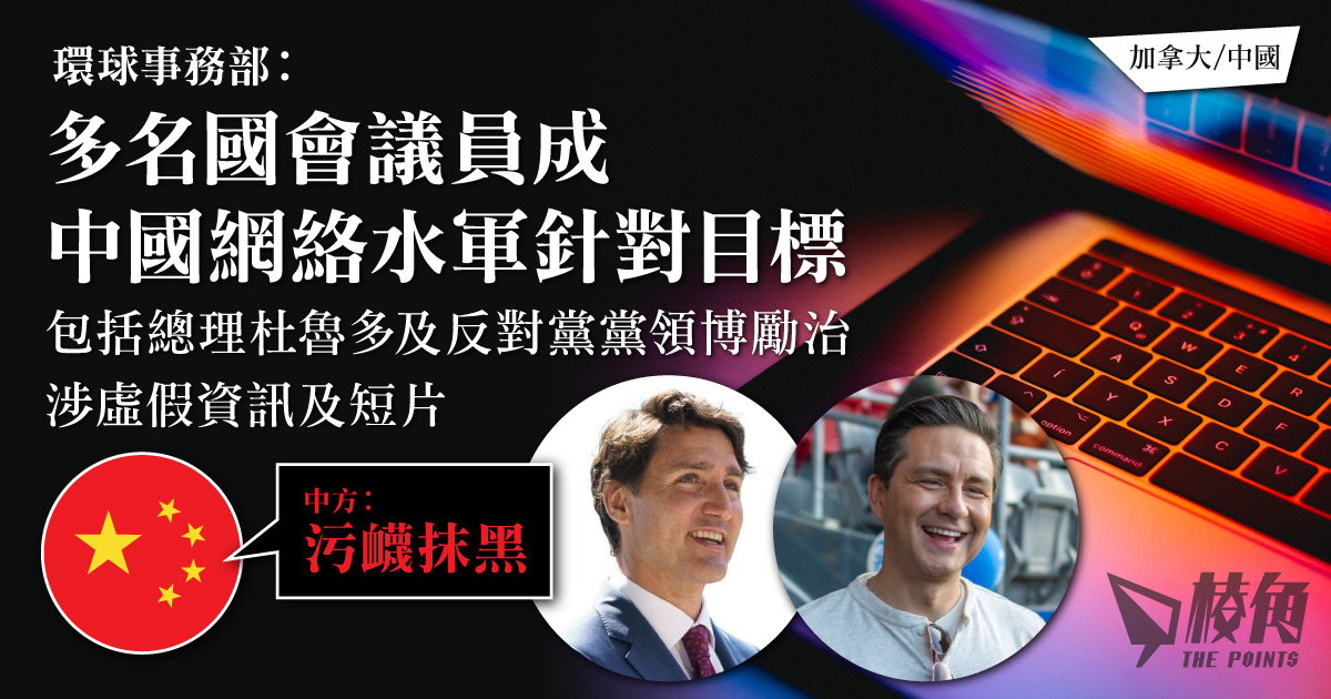 加拿大環球事務部周一發聲明指,相信中國政府與多名國會議員的社交媒體帳號,於8月至9月期間被如網絡水軍針對的事件有關。被針對的對象,包括總理杜魯多及反對黨黨領博勵治。該聲明指,網絡水軍在這些帳號以英、法語大量留言,附上虛假訊息、通過「深偽」技術製造的短片及連結等,假扮是中國異見者,對加國的政治人物提出虛假的指控。聲明指有關行動的目標除了是影響加國政治人物的聲譽,亦影響議員使用社交媒體與包括異見者在內等民眾進行交流的行為,亦令異見者更難發聲。