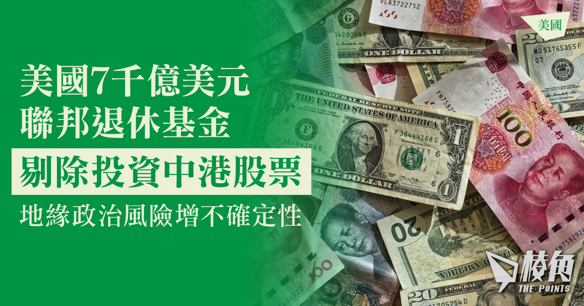 由於美中角力,地緣風險升温增加投資不確定性,美國聯邦政府退休基金接納顧問公司建議,投資組合剔除投中國及香港的上市公司股票。該退休基金規模達7,710億美元,當中佔680億美國的國國際基金追蹤的基準指數。