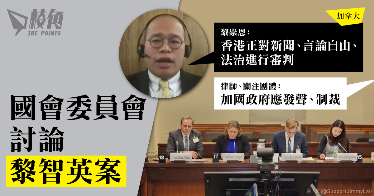 加拿大國會一個委員會於周二舉行聽證會,就香港黎智英案聆聽黎智英兒子黎崇恩,律師團隊及關注香港團體等意見。黎表示現時父親的審訊是明顯的政治審訊,也是對香港的言論自由、新聞自由及法治進行審訊。黎的國際律師團隊就指,最少4名聯合國專員對案件表達關注,上周酷刑專員更表示案中控方證人李宇軒可能於內地被虐待逼供,他們希望國會議員可向加國政府施壓,就事件更積極發聲,及制裁香港官員。