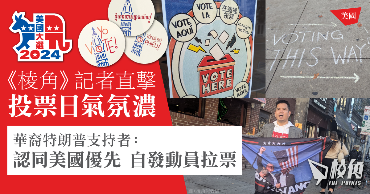 在華埠的票站附近,記者亦有留意有約十名華人手持特朗普的旗幟,在幾個十字路口上為他拉票,而在馬路另一邊,亦有幾人手持支持賀錦麗的紙牌打對台,但氣氛大致平和。