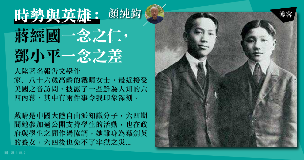 凡是政治改革,永遠都有左右兩方的角力,進步力量要向前,保守力量拉後腿,那時便取決於政治領袖的政治見識與歷史胸襟。蔣經國初行改革時,身邊心腹提醒他這樣搞下去會危及國民黨的統治,蔣經國答以「世上沒有永遠的執政黨」。蔣經國將黨的利益置於人民的利益之下,鄧小平將中共的利益置於中國人民的利益之上——二人思想境界如此天差地別。