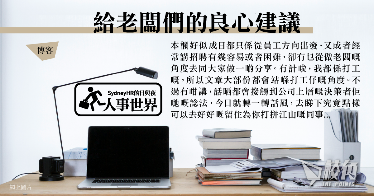 本欄好似成日都只係從員工方向出發,又或者經常講招聘有幾容易或者困難,卻冇乜從做老闆嘅角度去同大家做一啲分享。冇計啦,我都係打工嘅,所以文章大部份都會站喺打工仔嘅角度。不過有咁講,話晒都會接觸到公司上層嘅決策者佢哋嘅諗法,今日就轉一轉話風,去睇下究竟點樣可以去好好嘅留住為你打拼江山嘅同事。