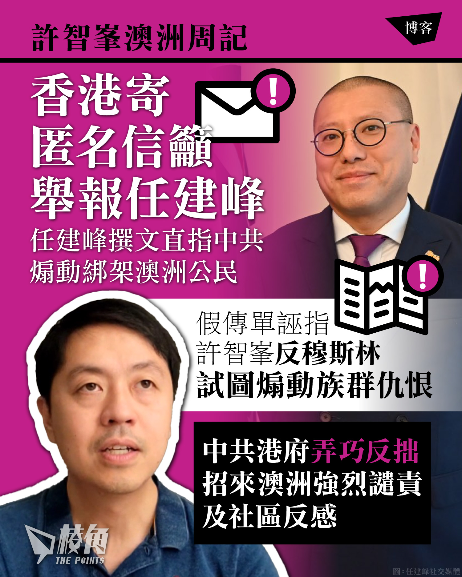 ▸ 許智峯收到偽造傳單,在阿德萊德的清真寺派發,誣指他支持以色列攻擊穆斯林群體,煽動族群仇恨,危及其人身安全