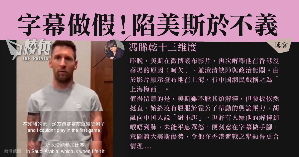 理由不言而喻:邁亞密國際亞洲之行有四站,除了香港,美斯場場皆有出賽。「上海梅西」大概想令香港看起來不那麼孤單,就在翻譯中「美化」一下,讓中国網民以為美斯傷得很重,連沙地首場也要缺陣。