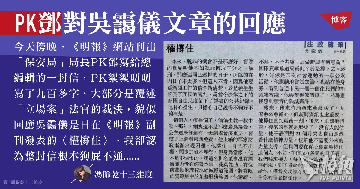 今天傍晚,《明報》網站刊出「保安局」局長PK鄧寫給總編輯的一封信,PK絮絮叨叨寫了九百多字,大部分是覆述「立場案」法官的裁決,貌似回應吳靄儀是日在《明報》副刊發表的〈權撐住〉,我卻認為整封信根本狗屁不通。試看此信的頭兩段: