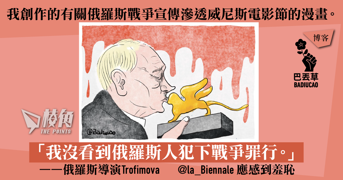 主頁 政治 【Badiucao 巴丟草... 【Badiucao 巴丟草】我創作的有關俄羅斯戰爭宣傳滲透威尼斯電影節的漫畫。 2024年09月09日 我創作的有關俄羅斯戰爭宣傳滲透威尼斯電影節的漫畫。 「我沒看到俄羅斯人犯下戰爭罪行。」 ——俄羅斯導演Trofimova @la_Biennale 應感到羞恥 作者: 巴丟草Badiucao 政治漫畫家/人權分子/反共反極權/反種族主義 支持我們:https://www.ls1.points-media.com/supports/