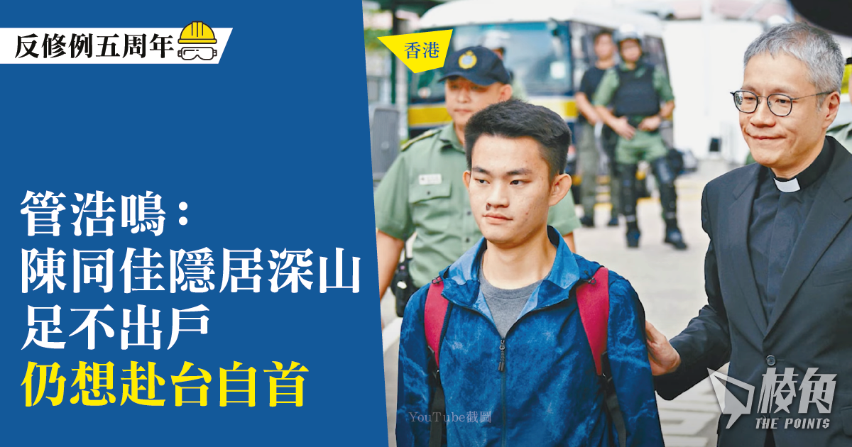 反修例運動至今5年,觸發政府修訂《逃犯條例》的台灣殺人案疑犯陳同佳,仍未赴台投案,他在香港因洗黑錢罪名被判囚,出獄超過 4年半。一直協助陳同佳的選委界立法會議員管浩鳴接受《商台》訪問時指,陳同佳自2021年離開警方安全屋後,仍然居於偏遠地區的深山,無出過門。管浩鳴強調,陳同佳仍然希望到台灣承擔刑責。