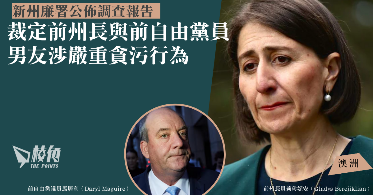 新南威爾斯州廉政公署(ICAC)裁定前州長貝莉珍妮安(Gladys Berejiklian),與其前男友、前自由黨議員馬居利(Daryl Maguire)涉嚴重貪污行為。ICAC建議刑事檢控專員(DPP)就檢控馬居利及其他兩名生意夥伴,尋求法律建議; 但未有建議檢控貝莉珍妮安。