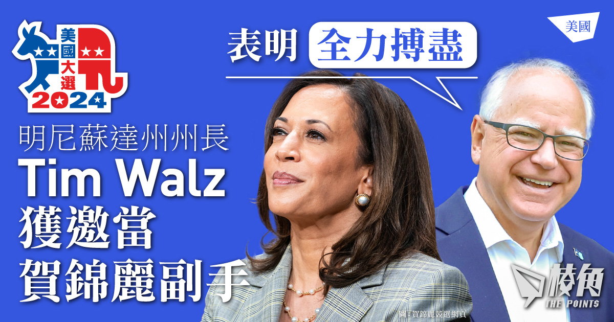 - 賀錦麗在周二宣布其副手人選為明尼蘇達州州長沃爾茲