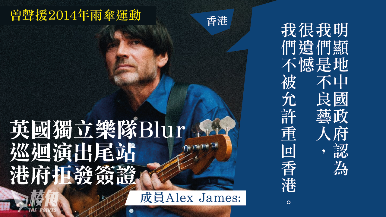 曾於2014年雨傘運動期間,在港創作多首歌曲及專輯聲援示威者的英國獨立樂隊Blur正舉行巡迴演出,並希望將尾站設在香港。樂隊成員Alex James周一(6日)在電台節目中表示,他們簽證申請被港府拒絕,因此無法再次來臨香港演出。