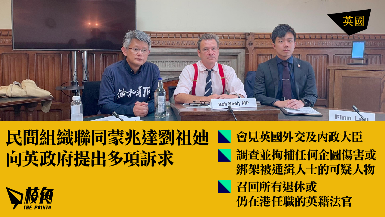 國安處早前向八名海外流亡人士發通緝令,香港自由委員會基金會(CFHK)周三(五日)聯同兩名被通緝人士,前職工盟總幹事蒙兆達及《棱角》執行總監劉祖廸於英國國會召開會議,劉祖廸於會上向英國政府提出多項訴求 。包括要求會見英國外交大臣祈湛明(James Cleverly )及內政大臣柏斐文(Suella Braverman);促請英國政府保護在英流亡人士,調查並拘捕任何企圖傷害或綁架被通緝人士的可疑人物;及召回所有退休或仍在香港法院任職的英籍法官,否則褫奪其上議院頭銜並禁止於英國執業。