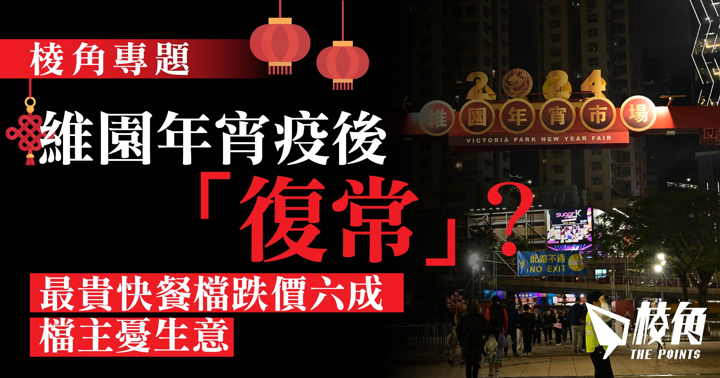 繼2019年後,維園年宵首次「復常」設有乾貨檔及快餐檔,4個面積5米乘4米的快餐檔底價約12萬元,比疫情前20萬元低四成,成交價18萬至22萬元,「焦點檔位」為銅鑼灣出入口的快餐檔,成交價22萬元,比底價高出10萬元,但呎價則比2019年同地段快餐檔低逾兩成,單計成交價跌幅近六成。2019年「焦點檔位」設有面積7.6米乘4.8米的快餐檔,底價約37萬元,成交價約52萬元。