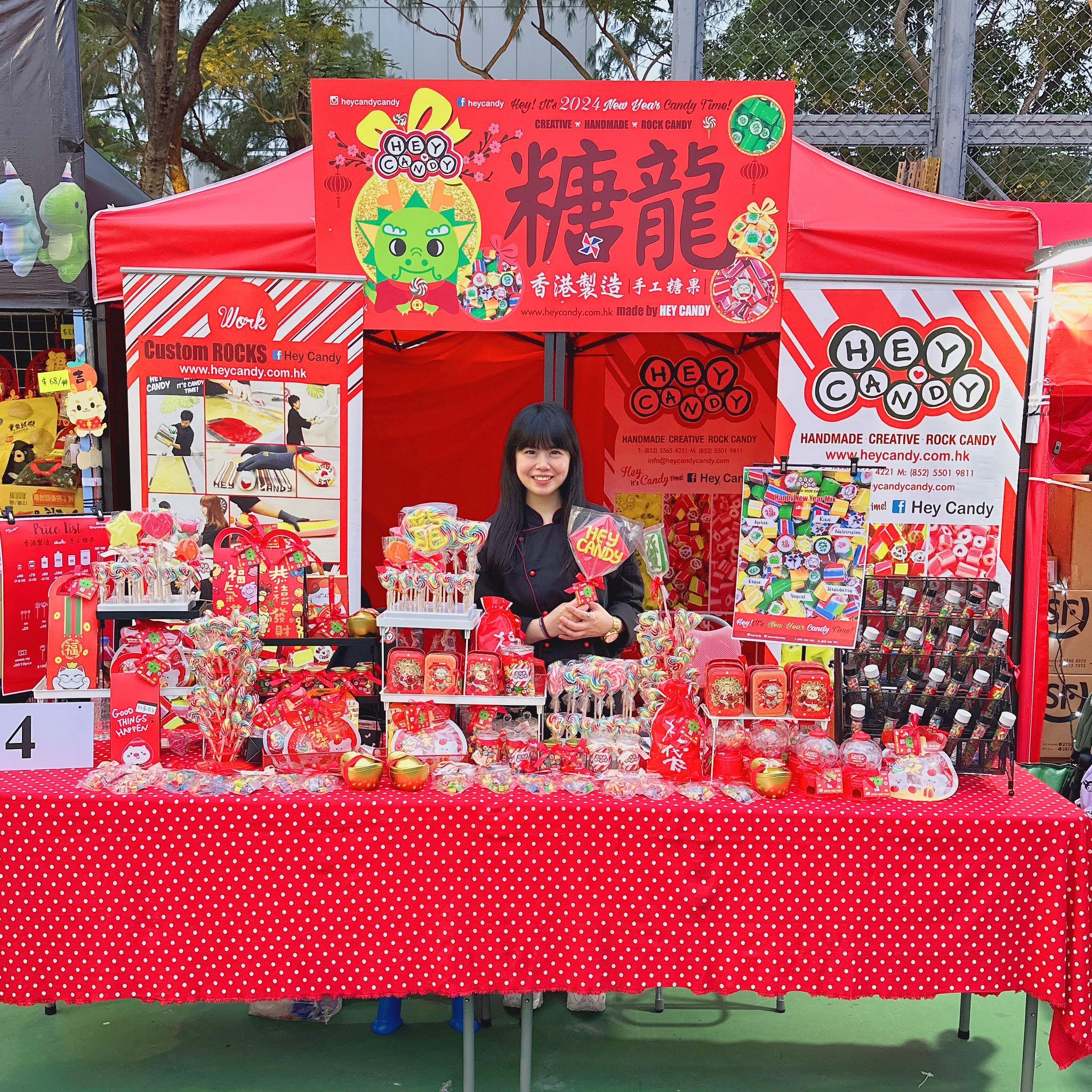 乾貨檔「糖龍」特地為龍年推出新年祝賀詞及龍系列造型手工糖果,檔主李小姐表示,疫情前都有擺檔,但今年人流不如以往,下雨是主要因素。她又指行年宵的主要都是香港市民,未見有太多旅客。
