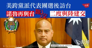 台灣大選結果於13日塵埃落定,南太平洋島國諾魯(Nauru,又譯瑙魯)卻於周一(1月15日)突然宣佈與台灣斷交,並與中國大陸恢復邦交。這是該國史上第二次與台斷交並轉向與大陸建交。