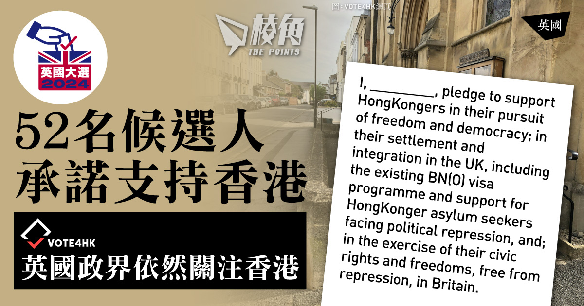 在英港人發起的「Vote for Hong Kong 2024」(V4HK) 在周二(7月2日)表示,自去年10月邀請國會候選人,尤其是那些港人聚居選區的候選人,簽署承諾書及回應立場申述問卷,以表達對香港的支持。截至7月2日,一共收到來自41個選區的52名候選人簽署了承諾書,或另外發表聲明以示支持香港的立場。