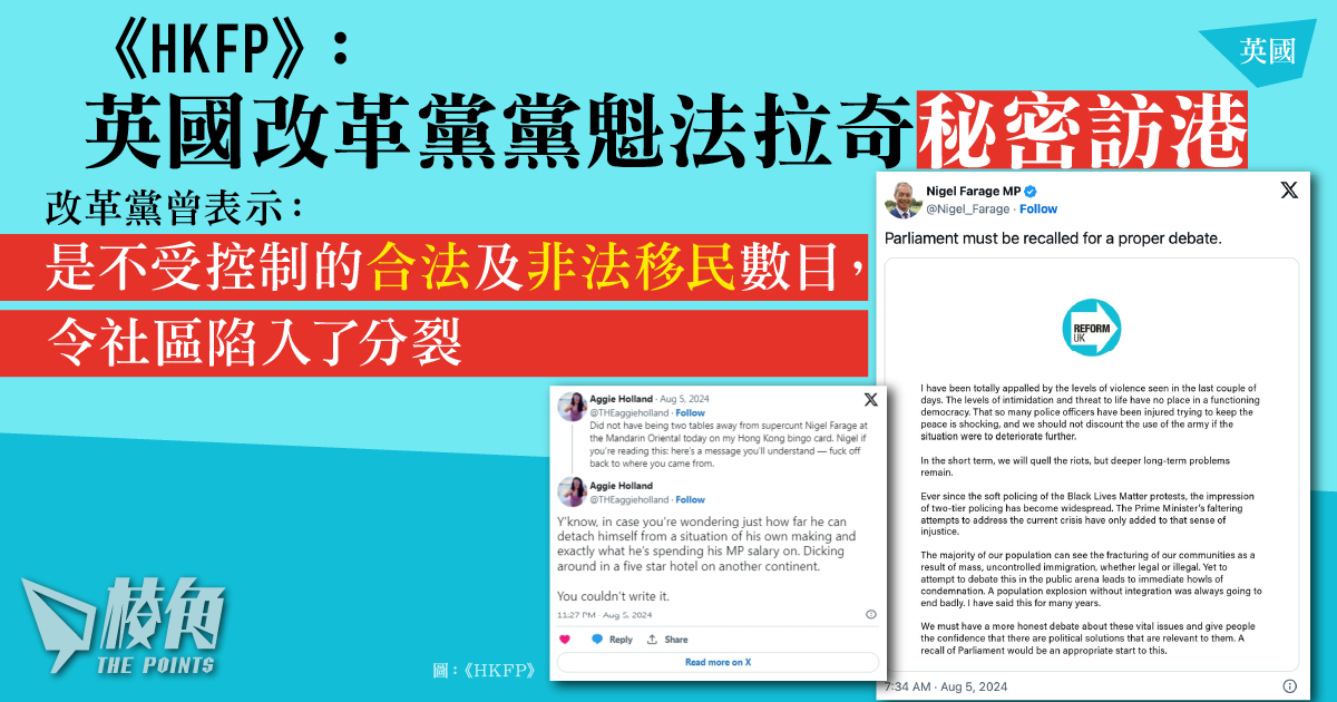 紹斯波特(Southport)斬人案引發的騷亂惡化,並擴散至英國多個城市。英國右翼改革黨(Reform UK)被指有份誤傳有關斬人案疑兇身份及國籍的謠言,激發針對回教徒、移民及難民的極右暴力事件。 香港英文傳媒《Hong Kong Free Press》(下稱HKFP)周二(6日)刊登獨家報道,指改革黨黨魁法拉奇秘密現身香港文華東方酒店,報料人士批評法拉奇無視國內右翼騷亂外出旅遊,要求他「滾回自己的地方」(fxxk off back to where you came from)。