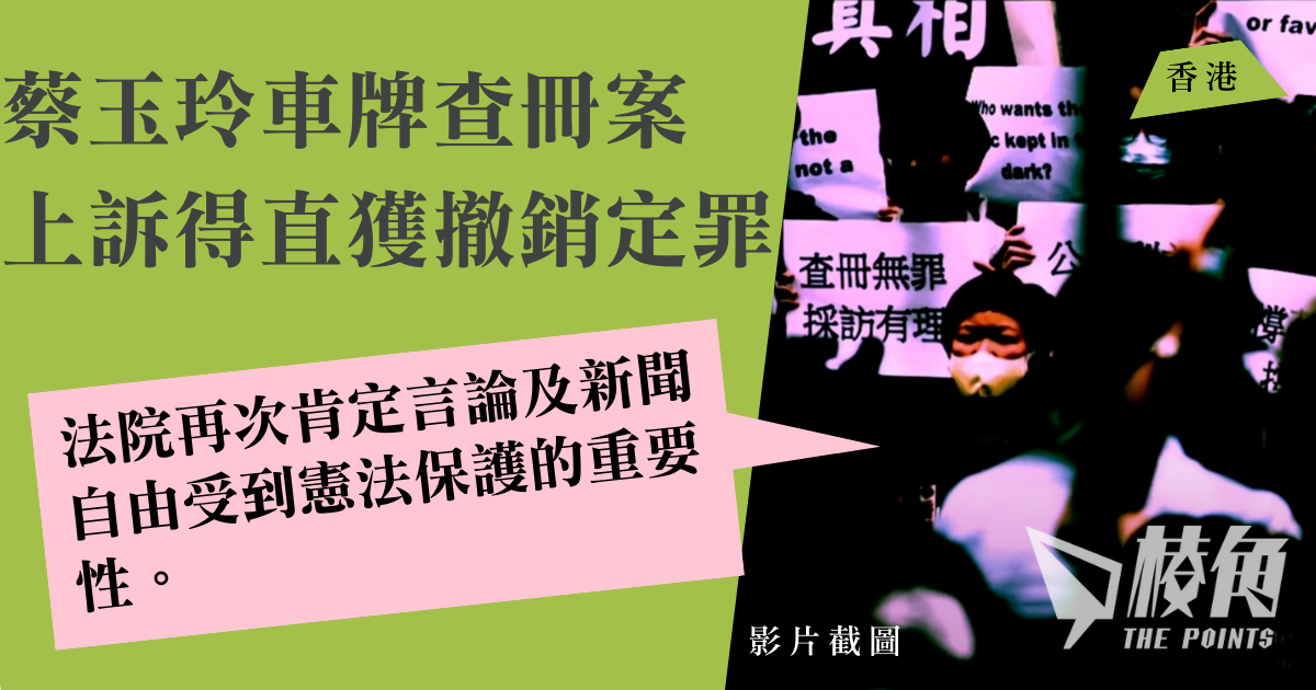2020年,時任香港電台旗下節目《鏗鏘集》編導的蔡玉玲因於製作有關元朗「7.21」事件的專題報道,向運輸署申請車牌查冊,而被裁定兩項虛假陳述罪名成立及罰款。蔡玉玲隨後上訴至終審法院,今日(6月5日)獲5名法官 上訴得直,撤銷各項定罪。