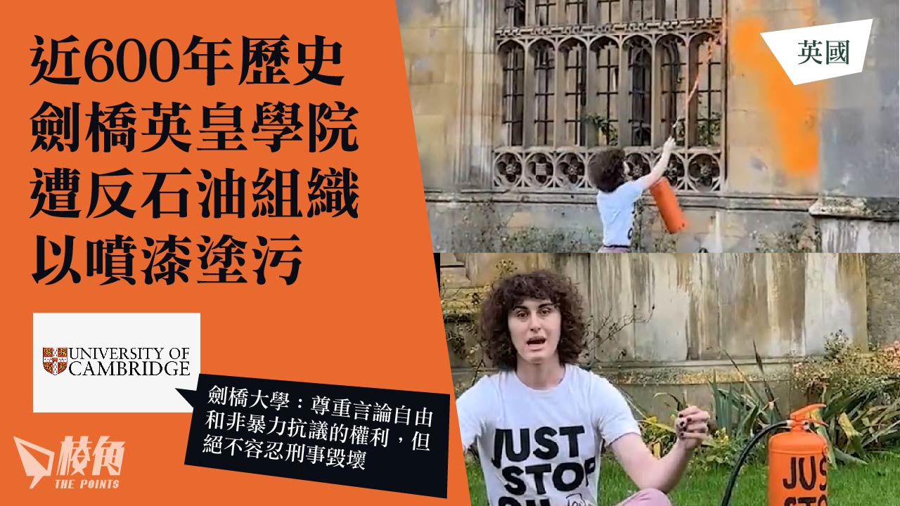 反石油組織Just Stop Oil,最近不斷在英國各地公開場合展示橫額及以噴漆塗污著名地標,以宣揚全球暖化及停止開採石油訊息。組織周四(12日)在劍橋大學英皇學院(King’s College)的一棟建築物外,用滅火筒向外牆噴灑橙色油漆,事後拍片上載到社交平台。劍橋大學表示,尊重言論自由但絕不容忍刑事毁壞。