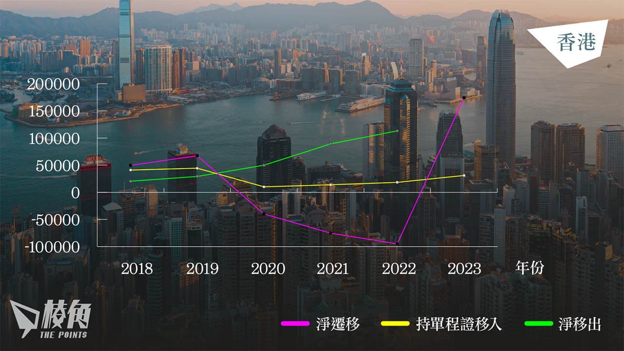 翻查統計署過往年中人口統計數字,2018年及2019年的「香港居民淨遷移」人口均錄得正增長,則移入入口比移出人口多,持單程證移入的人口維持在4萬左右。由2020年起至去年中期,淨遷移人口均錄得負數,淨移出人口累計超過25萬。今年再次錄得正增長,香港居民淨遷移高達174,000人,扣除持單程證移入的人口,有超過15萬於去年至今年年中湧港。