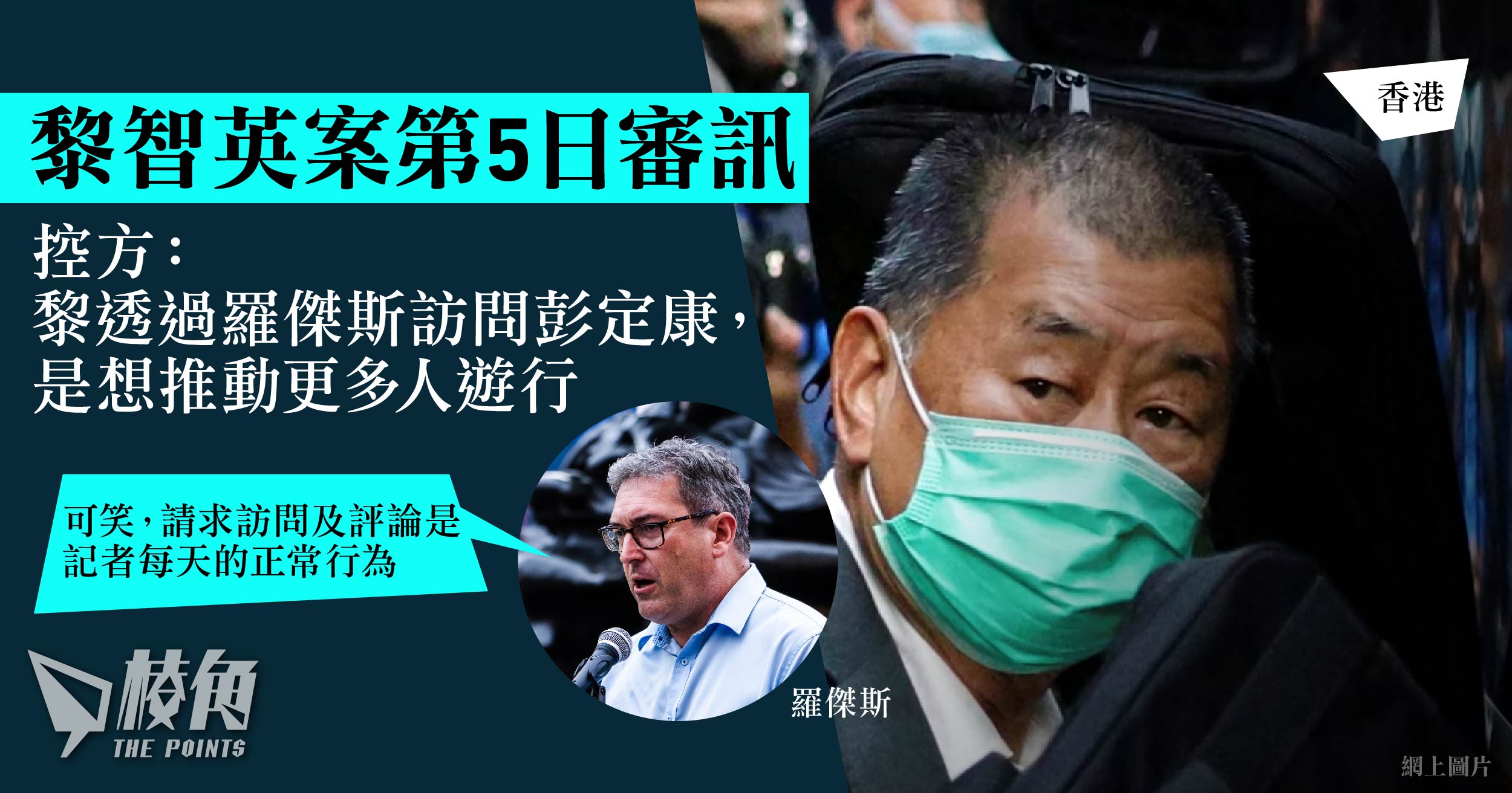 壹傳媒創辦人黎智英與《蘋果日報》3間相關公司,被控違反《國安法》的案件,於周三(3日)踏入第5日審訊,控方繼續作開案陳詞,提到黎智英指示高層安排訪問前港督彭定康、銅鑼灣書店前店長林榮基等都具有推動群眾上街的目的。控方又指,黎與時任眾議院議長佩洛西會面後,指示《蘋果日報》副社長陳沛敏訪問自己。