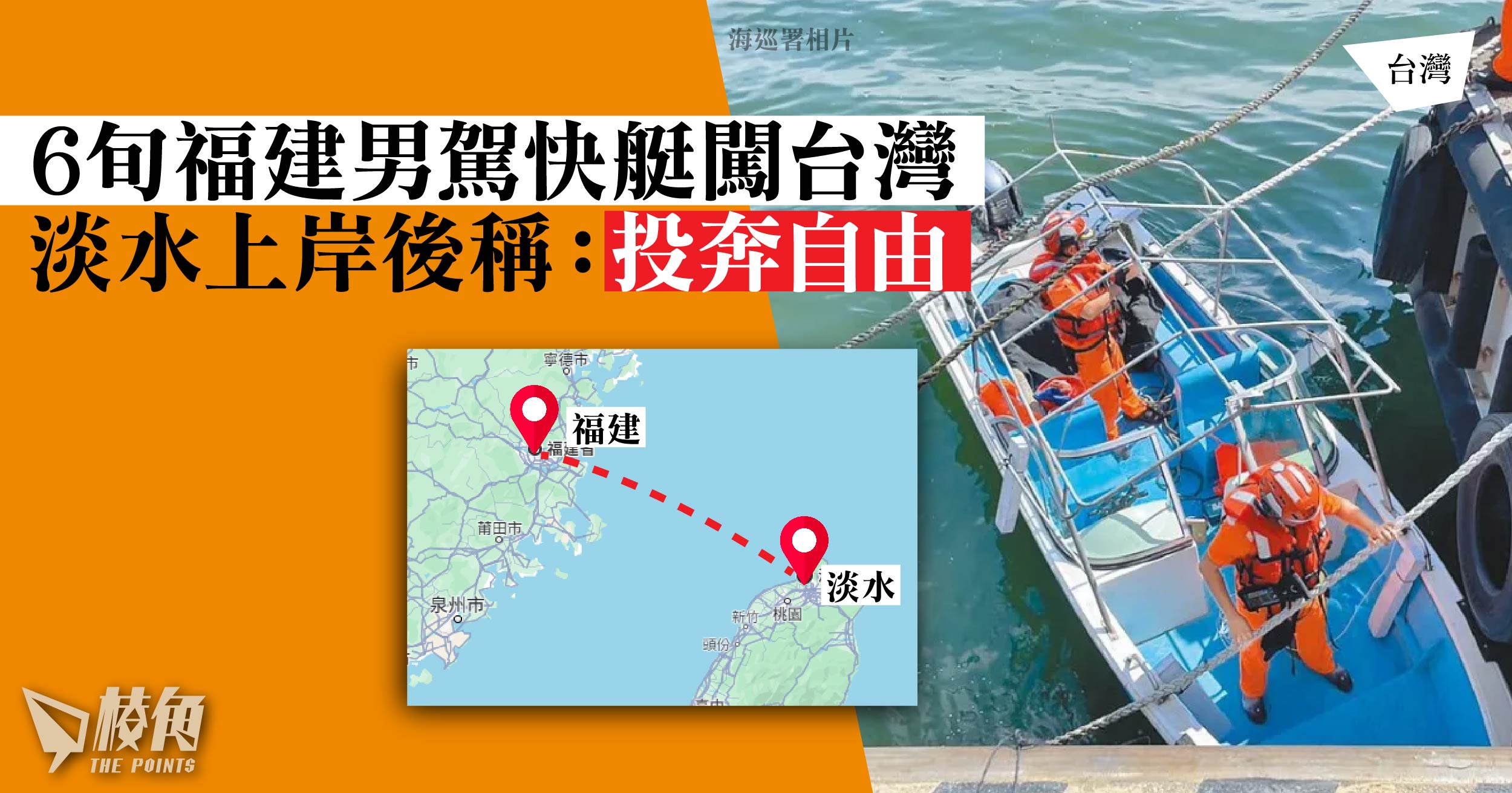 - 一名約60歲中國籍男子周日(9日)駕駛快艇從福建,抵達新北市淡水漁人碼頭