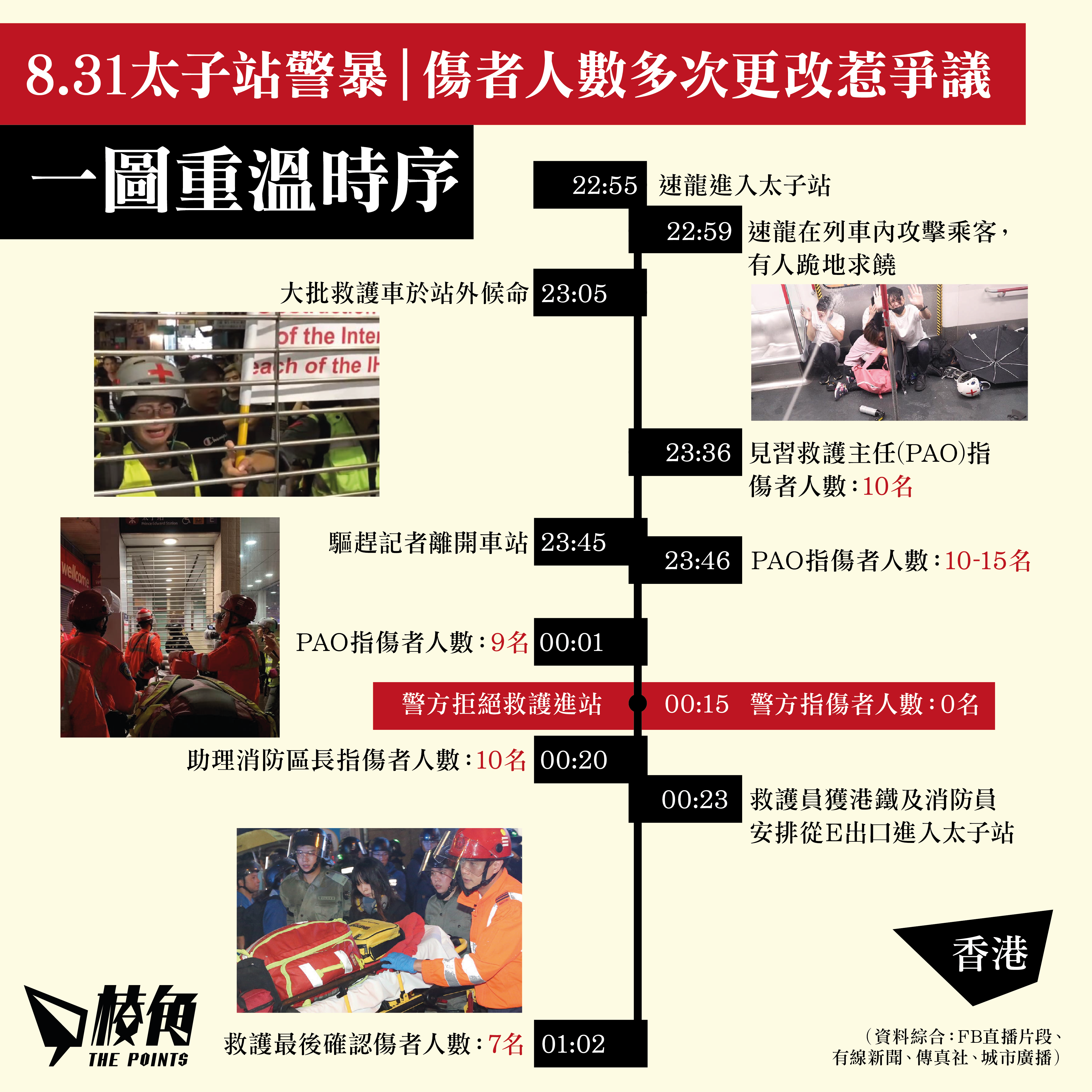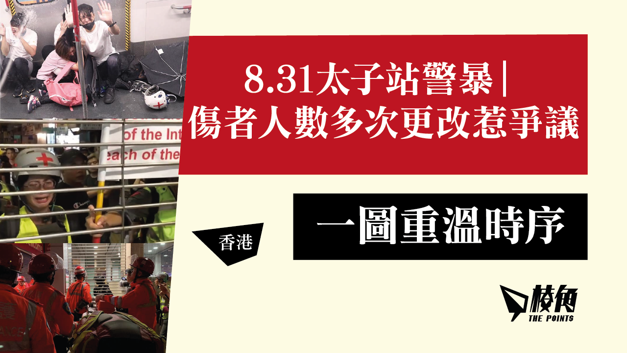 「8.31」太子站警暴四周年,2019年8月31日晚,旺角及油麻地一帶有反修例示威行動,其後演變成衝突,警方追捕示威者到太子站。大批速龍及防暴警在站內及車廂內無差別攻擊示威者及乘客,期間使用警棍、胡椒噴霧攻擊,有乘客互相保護,甚至跪地求饒。其後有人受傷流血、倒地、被警方制服等,場面混亂,傷者人數亦多次被更改。《棱角》綜合當日多條Facebook及新聞直播片段、網媒及學生記者的報道,重整當日事發經過。