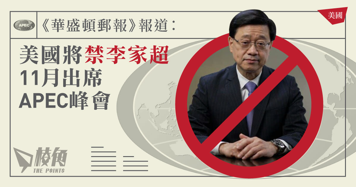 《華盛頓郵報》周四(7月27日)晚報道,美國政府已決定禁止正被制裁的香港特首李家超,於今年11月出席於三藩市舉行的亞太經合組織峰會。報道指美方官員認為,屆時香港仍可以派出其他代表出席。《郵報》引述專家意見,認為中國國家主席習近平在權衡後,仍然會出席該會議。中國駐華盛頓大使館回應指「強烈反對李被禁入境美國」,認為美方違反亞太經合組織的規定及之前的承諾。香港特首辦暫未有回應。