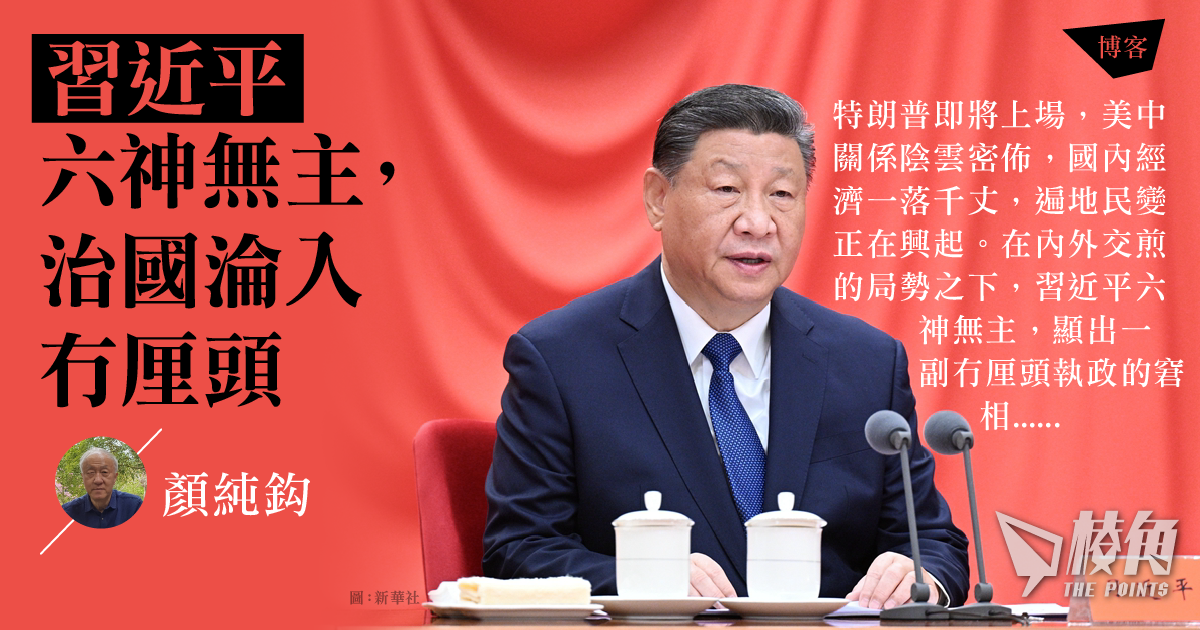 特朗普即將上場,美中關係陰雲密佈,國內經濟一落千丈,遍地民變正在興起。在內外交煎的局勢之下,習近平六神無主,顯出一副冇厘頭執政的窘相。