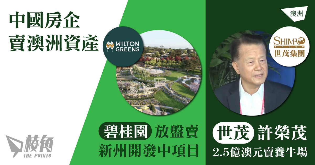 路透社報導,中國房企碧桂園虧損嚴重,正面對發境外債務違約風險。目前它正出售澳洲雪梨Wilton Greens等一系列的海外開發項目,籌集資金還債。另一家中國房企世茂集團主席許榮茂亦正以2.5億澳元,放售他家族擁有、位於西澳洲的養牛場。