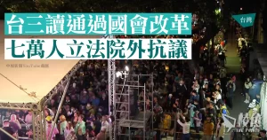 - 周二晚,反對改革的民眾繼續聚集在台北立法院外示威,主辦單位稱有七萬人參與,而其他縣市亦有較小規模的抗議集會