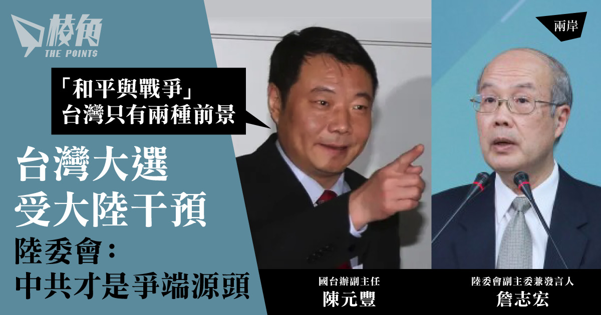 台灣陸委會21日例行記者會上表示,中共干預台灣總統大選招數多,除了經濟打壓、軍事威嚇外,並以低價旅遊團、假訊息製造、賭盤等干預台灣總統大選。另外中國國台辦指台灣正面臨「和平與戰爭」兩種前景選擇,陸委會同日回應指,台灣一直希望維持兩岸和平穩定,中共才是持續以窮兵黷武、戰爭威脅挑起爭端源頭。