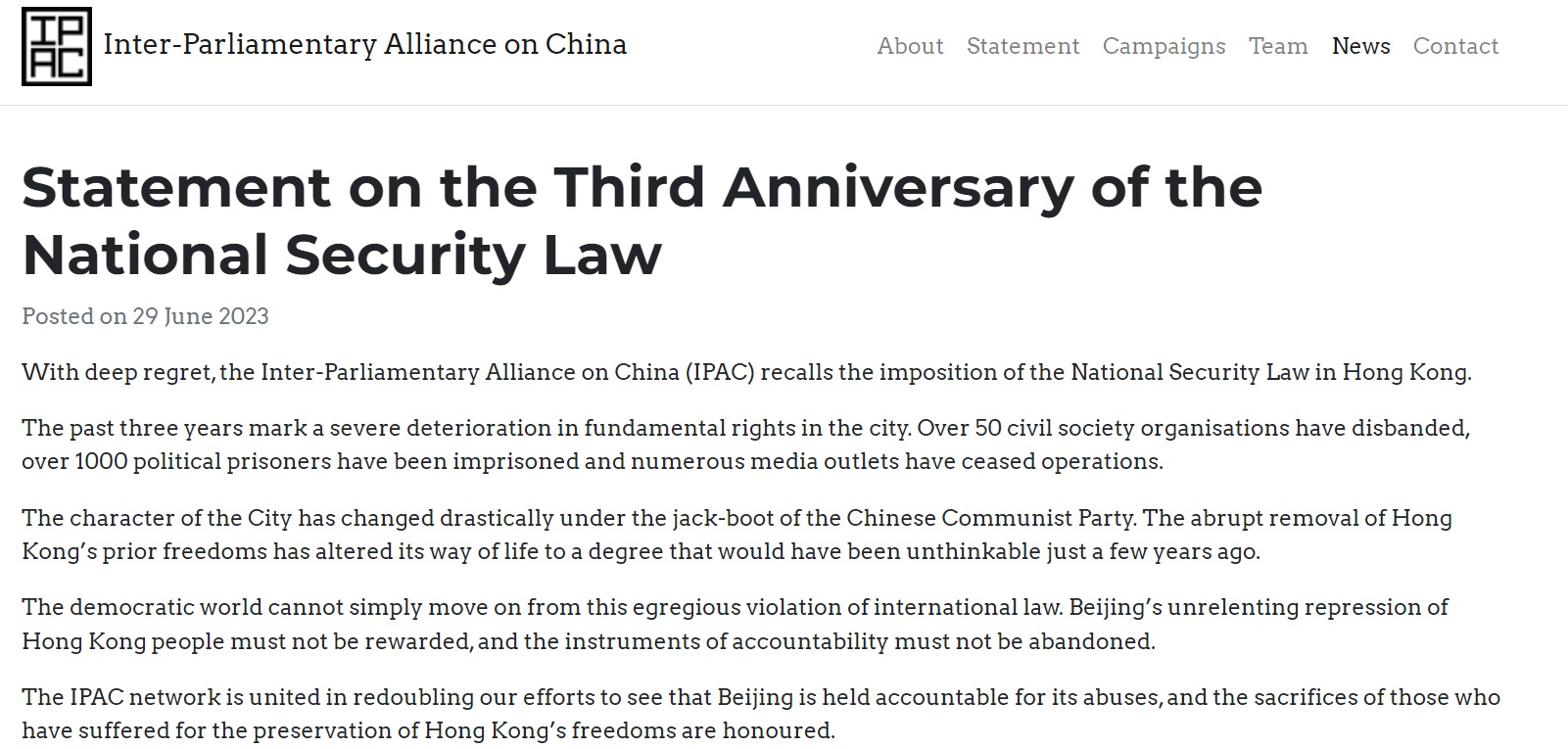 IPAC聯盟 47 位成員發表措詞強硬的聲明,批評香港本身的城市特質在中共鎮壓下大幅改變,過去種種的自由急劇消失,生活方式變化的程度是幾年前所不能想到的。聯盟強調北京要為違反國際法侵犯香港的行為負責,因捍衛香港自由而受迫害的人都應被表彰。