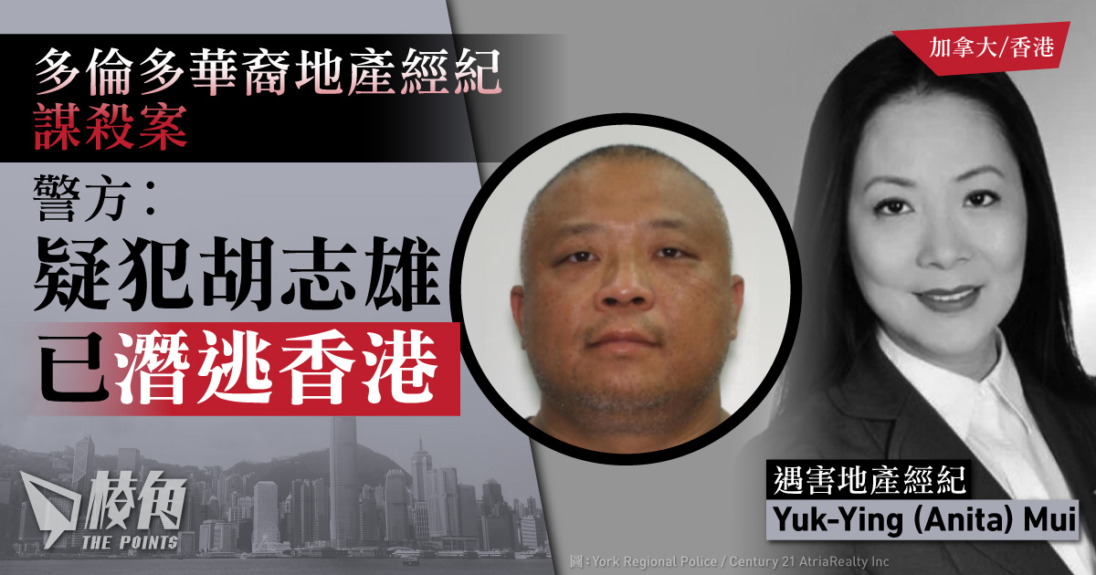 -警方指涉嫌謀殺華裔地產經紀梅育英的疑犯胡志雄已離開加拿大前往香港