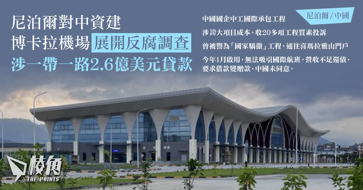 曾被北京視為「一帶一路」旗艦項目的尼泊爾博卡拉機場,自今年1月啟用後,一直吸引不到國際航班。該機場斥資達2.6億美元興建,由中國貸款,交由國企中工國際興建。月前《紐約時報》披露該工程成本被誇大,質素管控有問題後,尼泊爾的濫用職權調查委員會突擊搜查民航局,發言人表示正對該機場展開反腐調查。