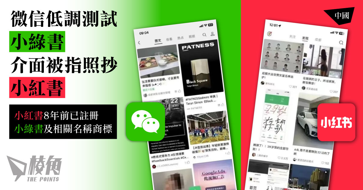 微信低調測試「小綠書」 介面似足小紅書 小紅書8年前已註冊小綠書及相關名稱商標