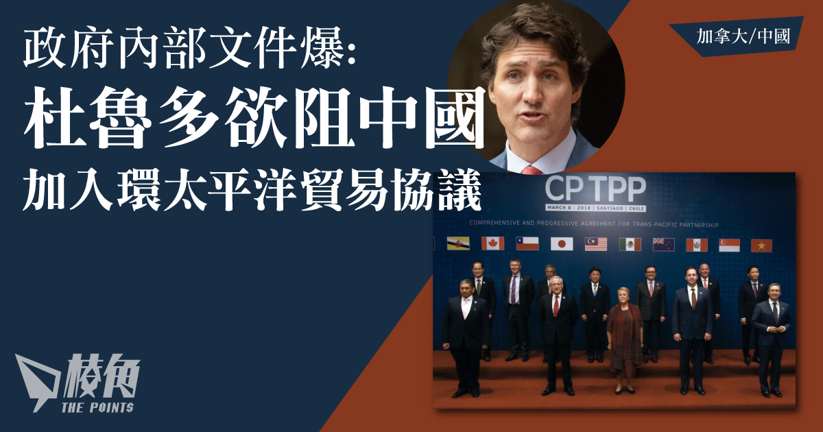 加通社通過《訊息獲取法案》取得加拿大聯邦政府內部文件顯示總理杜魯多欲阻止中國加入環太平洋貿易協議(CPTPP),現時加入該協議的成員國包括澳洲、加拿大、日本、智利、新加坡、馬來西亞、墨西哥、紐西蘭、汶萊、秘魯、越南及4月宣佈將於7月加盟的英國等共12個國家。CPTPP成員國人口規模達5億,GDP總額超過11萬億美元的區域經濟組織。