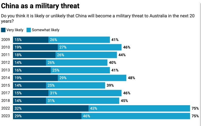 洛伊研究所每年進行的澳洲人如何看待世界和國際事務的民意調查。2023年的最新報告顯示,56%的受訪者稱,與中國的外交關係解凍有利於澳洲的國家利益,視中國為安全威脅而非經濟夥伴的比例亦降至52%,較過去兩年的63%大為下降。不過,若與5年前相比,當時只有12%澳洲人認為中國是軍事威脅。