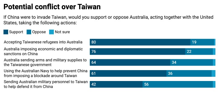 台海局勢緊張,一旦中國入侵台灣。洛伊報告顯示,近三分二澳洲人支持政府向台灣輸送武器及軍事物資,助台灣抵抗中國入侵; 61%澳洲人支持派海軍阻止中國封鎖台灣,不過只有42%支持派軍隊支緩台灣。