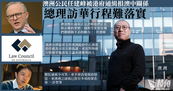 香港國安處懸紅通緝8名海外港人,引起西方民主國家反彈。澳洲、英國、美國及歐盟先後發聲明讉責。澳洲總理對澳洲公民任建峰及現時定居澳洲的許智峯被通緝,表示不能接受。外界認為事件影響澳中關係,總理訪華之旅更難落實。此外,澳洲法律協會發聲明對港府通緝8名海外人士表示關注,並對國安法域外法權有嚴重保留。