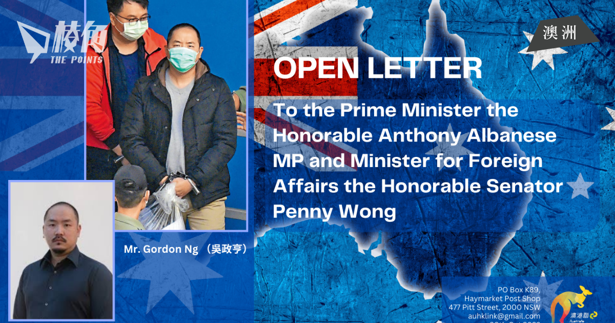 政治素人網名「李伯盧」的吳政亨,在47人初選案中被指為立法會民間初選的5名組織者之一,被控「串謀顛覆國家政權」罪,若被判有罪,刑期是由10年至終身監禁。澳洲的香港人組織澳港聯聯同澳洲6個港人組織,向澳洲總理阿爾巴尼斯(Anthony Albanese) 及外交部長黃英賢(Penny Wong)發出公開信。信中要求,總理11月4日訪華並將與習近平會面,重建澳中兩國外交及經濟關係時,切勿忘記為人權發聲,尤其香港實施國安法之後,大舉檢控民主派人士,當中一名澳洲國民吳政亨被指涉47人初選案。