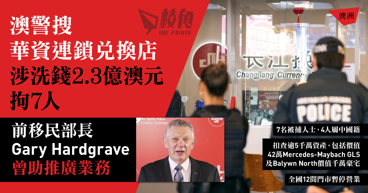 澳洲聯邦警察昨日10月25日大規模搜查華資兌換店集團「長江換滙」全澳12間門市,並於墨爾本東部豪宅內拘捕7人,包括4名中國籍人士及3名澳洲公民。警方指「長江換匯」協助網路詐騙集團、毒品走私、加密貨幣和暴力犯罪等犯罪分子洗錢,涉款2.3億澳元。「長江換滙」在澳洲業務龐大,前移民部長Gary Hardgrave亦曾為它拍廣告推廣業務。