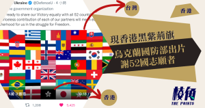 烏克蘭國防部周六晚(12月18日)在Twitter上載影片,感謝來自52個國家及志願者的支持,協助烏克蘭對抗俄羅斯。在影片顯示不同國家的國旗以示感謝,赫然發現香港的黑紫荊旗; 另外,台灣的中華民國國旗亦有出現。