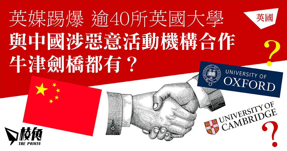 英國《泰晤士報》踢爆,英國至少有40所大學與中國政府機構合作,並稱該些機構與新疆維吾爾族遭受種族滅絕、間諜活動、開發核武、國防研究及網絡黑客攻擊有關。