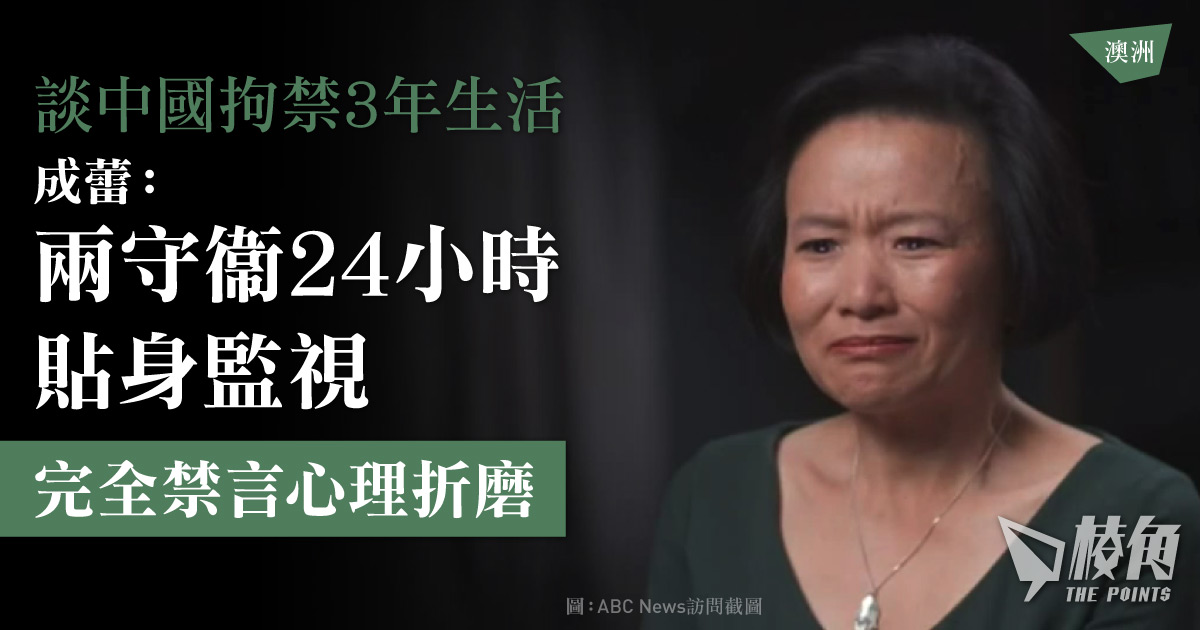 澳籍華裔記者成蕾被中國以「向外國機構洩露國家機密」罪拘禁3年,早前終於獲釋返回澳洲。她最近接受澳洲ABC新聞時事節目《7.30》訪問時談及過去獄中日子,在頭半年的定點監視,每日24小時有兩名守衞貼身監視,整日不准說話,對她來說是完全是一種酷刑、心理折磨,意圖摧毀她的精神狀態。她坦言目前已平安返回澳洲,雖然感到安全,但恐懼仍然揮之不去。