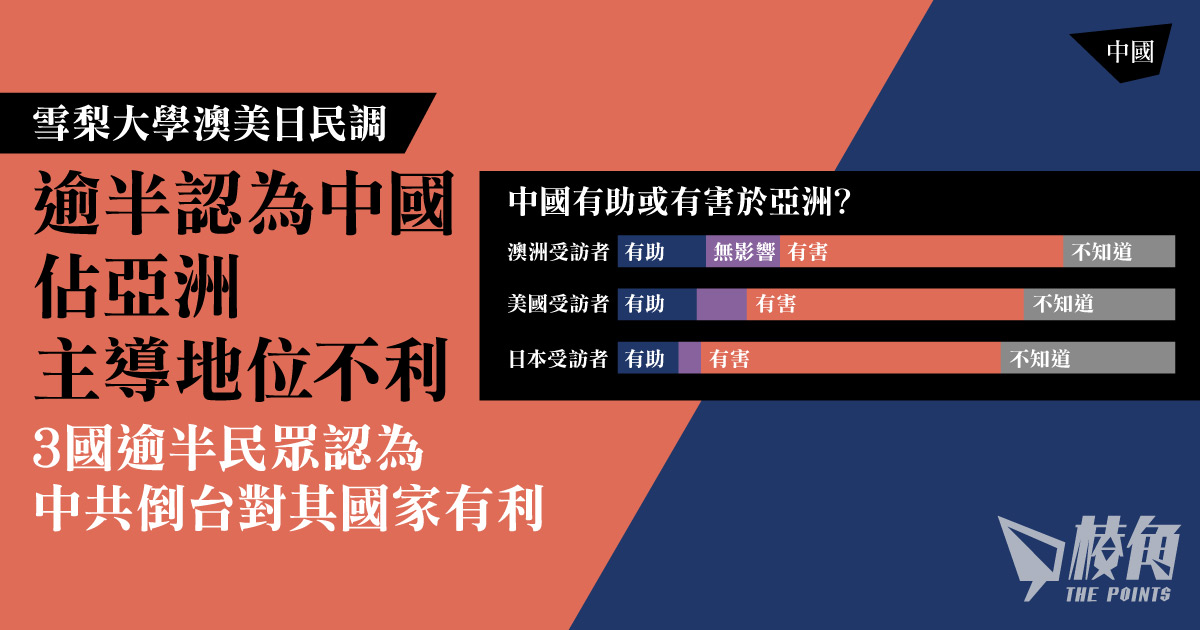 雪梨大學(University of Sydney)美國研究中心在在澳洲、美國和日本三國進行的民調發現,大部份的民眾對中國仍持有負面看法,澳中關係近日回暖,但澳洲公眾雖然對認為與中國發生軍事衝突的人有所減少,但仍然過半數認為中國在亞洲佔主導地位,不利該地區國家,日本及美國公眾也有類似看法,日本逾6成民眾認為對日本不利。當中問及中共倒對他們國家是好還是壞,竟然三個國家逾半公眾認有利於他們國家。