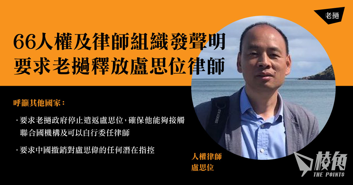 國際特赦組織、香港自由基金、香港監察等66個人權及律師組織發起聯署聲明,要求老撾政府立即釋放中國人權律師盧思位。7月28日,曾協助「12港人」的盧思位律師,在老撾遭到拘留,面臨強制遣返中國。聲明中還要求老撾政府安排盧律師可以跟聯合國機構的人員接觸。