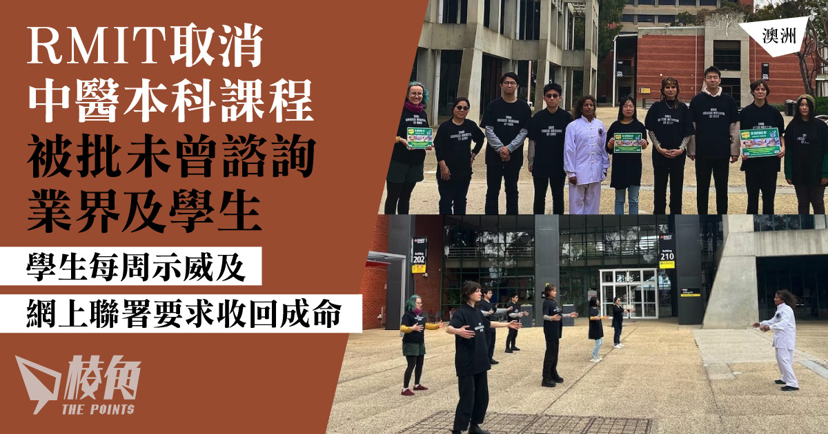 皇家墨爾本理工大學(RMIT)早前決定取消中醫藥學本科課程,並停止錄取新學年學生。該校的中醫學系學生,以及澳洲中醫藥界呼籲大學改變決定,並指在取消前大學未有諮詢學生及業界意見,認為RMIT取消課程對澳洲中醫學發生極具破壞性。該校學生發起網上連署,並每周在學園內舉行和平示威,要求大學收回成命。