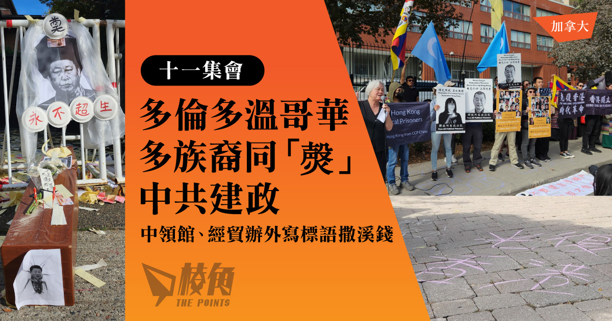 加拿大多倫多及溫哥華兩地,在10月1日都有針對中共建政74周年的遊行及示威。在多倫多的集會,約200名來自中、港、台、藏裔、維吾爾人等多個不同族裔的示威者參與。有人以粉筆在中國領事館及香港經貿辨外寫上「光時」等抗議標語。而在溫哥華,亦有約400人遊行至中領館外,他們並在貼有習近平「遺照」的棺材前焚燒中共國旗。