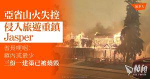 加拿大洛磯山脈地區內面積最大的Jasper國家公園的山火,於周三晚上失控並侵入Jasper城鎮範圍。亞省省長戴思敏在周四上午的記者會上強忍淚水,哽咽地表示,原本住有近5000人的鎮內最少三份一至一半的建築,相信都被山火燒燬。該鎮市長亦指,山火對居民造成「無法形容及理解」的損失。總理杜魯多就指,已因應亞省的請求,派遣軍隊參與救災。