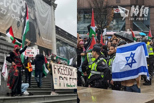 約300名攜帶巴勒斯坦國旗的示威者,周一到溫哥華市中心的溫哥華藝術館(Vancouver Art Gallery)外集會,支持加沙,現場有警員駐守;據悉,集會是由一個名為「巴勒斯坦青年運動」的組織發起。